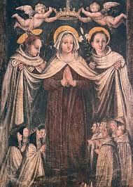 | An ancient painting depicting Carmelite nuns and friars sheltering under the mantle of Our Lady of Mount Carmel |